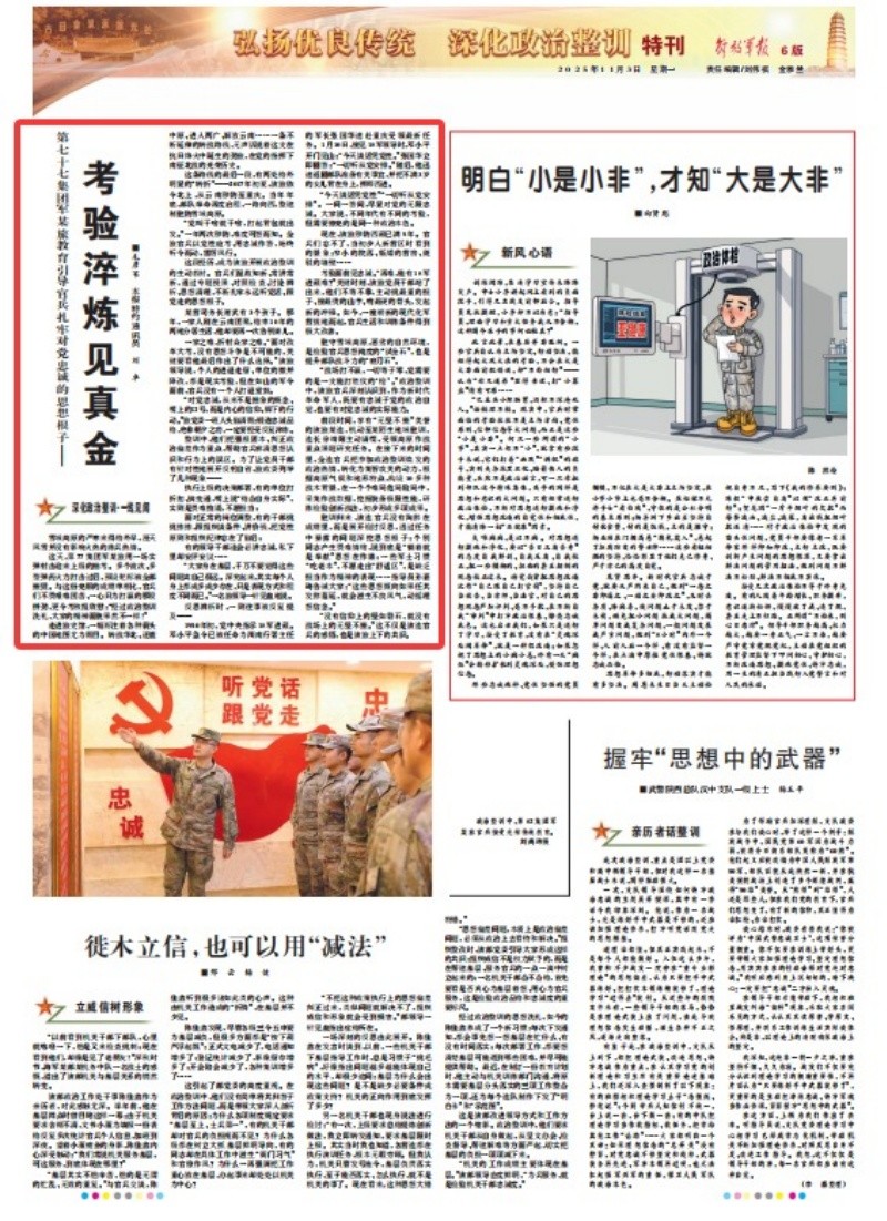 第七十七集团军某旅教育引导官兵扎牢对党忠诚的思想根子——考验淬炼见真金■毛彦苇 刘 卓雪域高原的严寒来得格外早,漫天风雪并没有影响火热的练兵热情。这天,第77集团军某旅用一场实弹射击迎来上级的抽考。多个波次、多型弹药火力打击过后,预设靶标被全部...