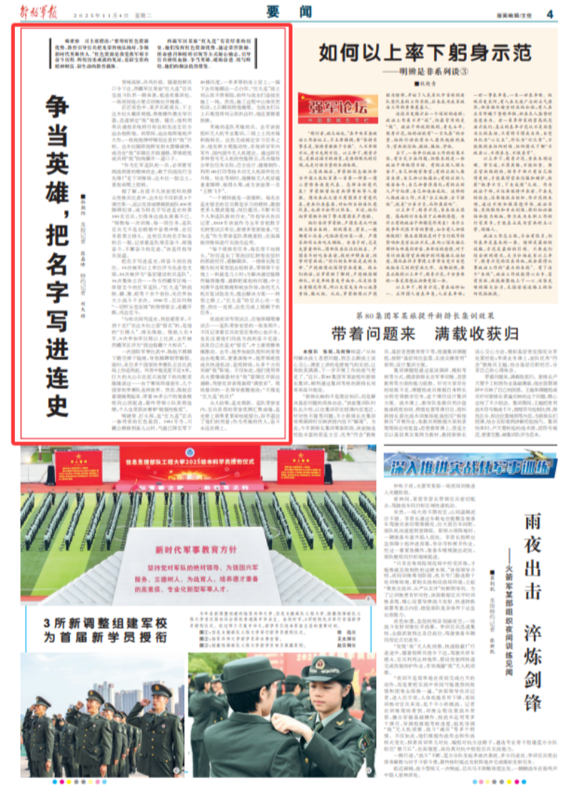 争当英雄,把名字写进连史■孙朝阳 张磊峰 刘大辉编者按习主席指出:“要用好红色资源优势,教育引导官兵把光荣传统弘扬好,争做新时代英雄传人。”红色资源是我党我军艰辛奋斗历程、辉煌历史成就的见证,是最宝贵的精神财富、最生动的教育载体。西藏军区某旅...
