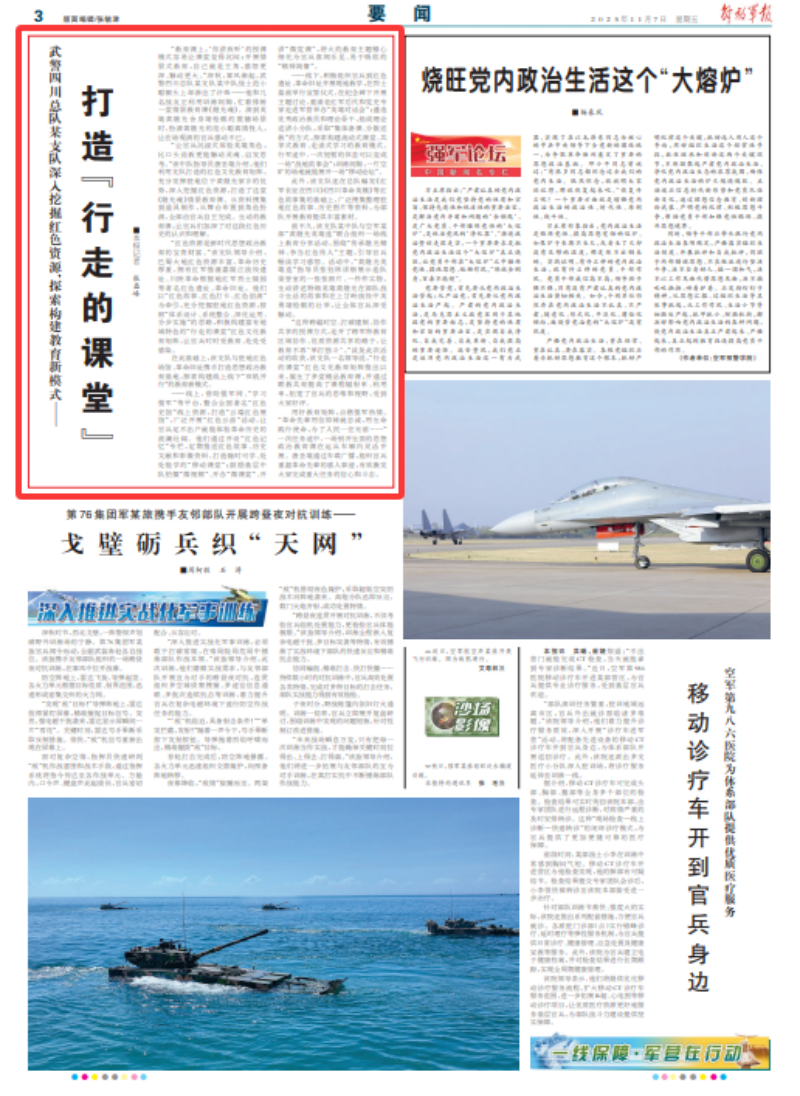 武警四川总队某支队深入挖掘红色资源,探索构建教育新模式——打造“行走的课堂”■ 张磊峰“教育课上,‘你讲我听’的授课模式容易让课堂变得沉闷;开展情景式教育,自己就是主角,感悟更深、触动更大。”深秋,寒风渐起,武警四川总队某支队某中队战士范小聪额头...