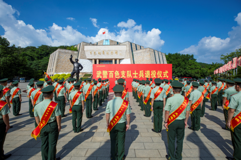 武警百色支队——驼铃声又响,挥手送老兵■ 唐明洋 练成林 于进龙驼铃悠扬,道不尽战友深情;军旗猎猎,挥不去军旅荣光。8月31日下午,武警广西总队百色支队在百色起义纪念馆前隆重举行2025年秋季士兵退役仪式,向圆满完成服役期的退伍老兵表达崇高敬意并欢送...