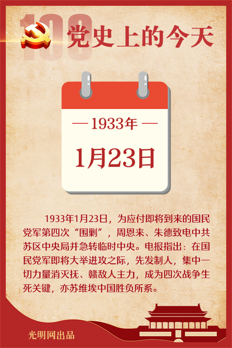 1月23日 为应付即将到来的国民党军第四次“围剿”,周恩来、朱德致电中共苏区中央局并急转临时中央。电报指出:在国民党军即将大举进攻之际,先发制人,集中一切力量消灭抚、赣敌人主力,成为四次战争生死关键,亦苏维埃中国胜负所系。随即,周恩来、朱德等指挥红一方面军主力争取在运动中消灭敌人。三十日,周恩来致电中央局并转临时中央指出:中央累电催我们攻破城防,与我两电所陈战略实有出入。但我终觉消灭敌人尤其主力,是取得坚城的先决条件。敌人被消灭,城虽坚,亦无从围我,我可大踏步地直入坚城之背后,否则徒损主力,攻坚不下正中敌人目前要求。 1956年