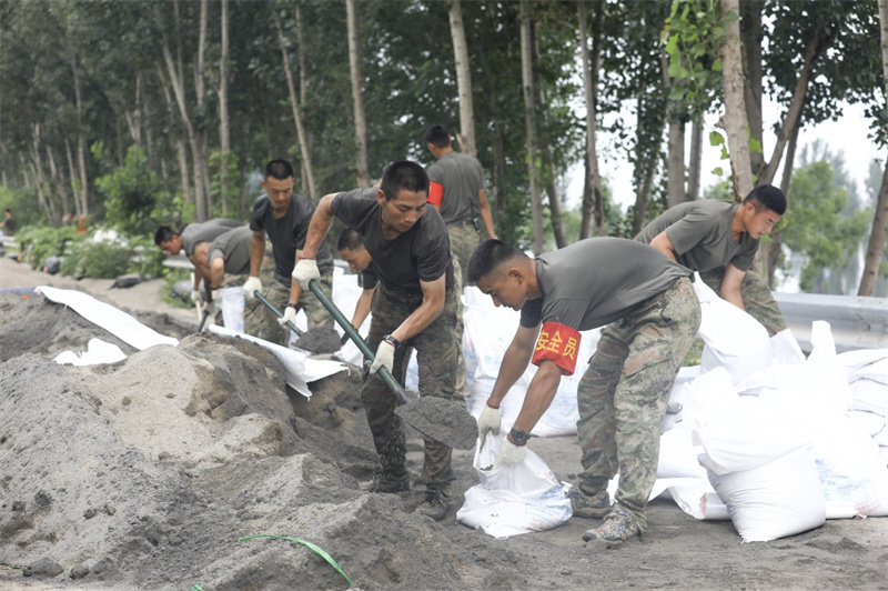 中部战区陆军第82集团军“铁军旅”官兵在大清河天津静海段加固堤坝(8月8日摄)。新华社发(杨仕伟 摄)