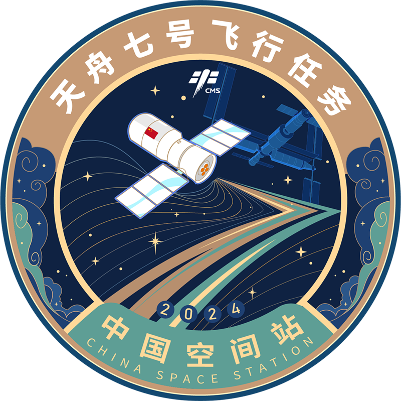 天舟七号飞行任务标识,正中的“7”色彩斑斓、直通远方,象征着我国航天事业在漫漫征程上勇往直前,在广袤太空中书写了浓墨重彩的一笔;空间站在路的尽头隐约浮现,象征本次天舟七号货运飞船将与空间站完成对接。边框提取中国传统云纹进行设计,作为经典的吉祥图案,寓意高升和如意。在万千金色星辰的点缀下,滚滚祥云在两侧舒展流动,护送画面中心的天舟七号货运飞船飞行,表达了对此次任务衷心的祝福。整体配色使用传统中国色彩,边框金镶玉的配色与中心的景泰蓝相结合,二者形成鲜明反差,引人入胜。