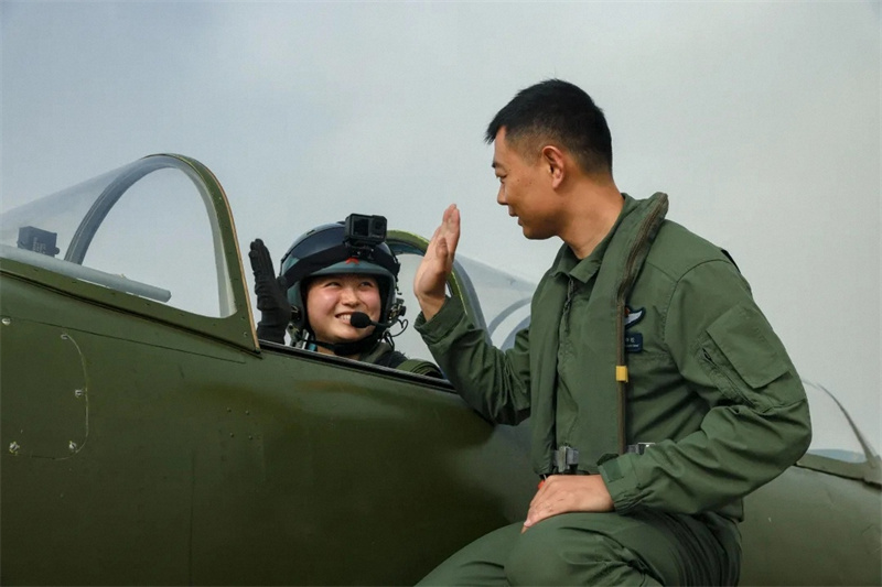 2024年4月25日,我国首批舰载机女飞行学员首次单飞。这是飞行学员(左)同飞行教官击掌。(于涛 摄)