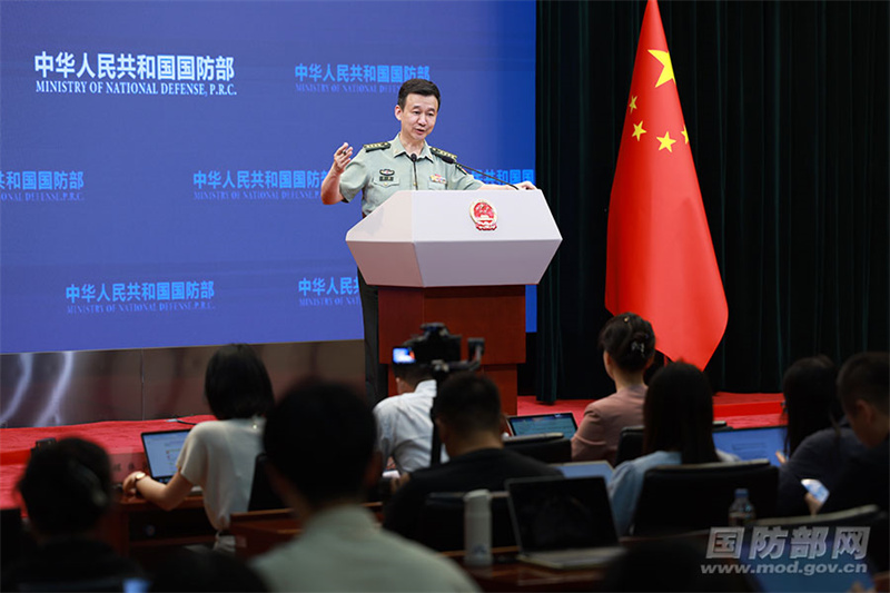 5月30日下午,国防部举行例行记者会,国防部新闻局局长、国防部新闻发言人吴谦大校答记者问。张智程 摄