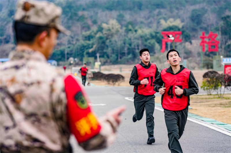 3000米跑道蒸腾着白雾,作训鞋砸地的闷响如战鼓擂动。某中队上等兵康述燚冲过终点时,电子屏亮起的成绩让他振臂低吼,“比上次快了半分钟!”在军事体育考场上,3000米跑、仰卧起坐、30×2蛇形跑、单杠引体向上等课目同时开展,再快一秒、每多做一个,参考战士不断突破极限,大家都把这次考核当作检验自身能力的试金石。“3000米跑快每一秒,离打赢就更近一步!”一旁的考官朱佳斌说道。