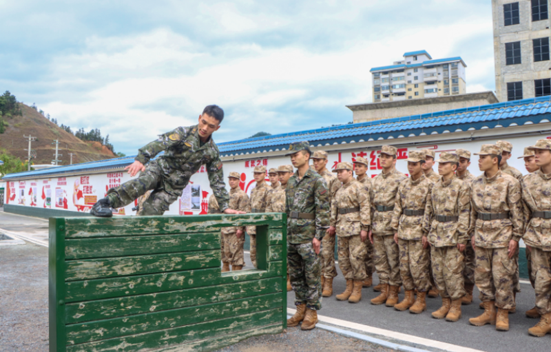 武警官兵为“准新兵”讲解演示通过矮墙动作要领。