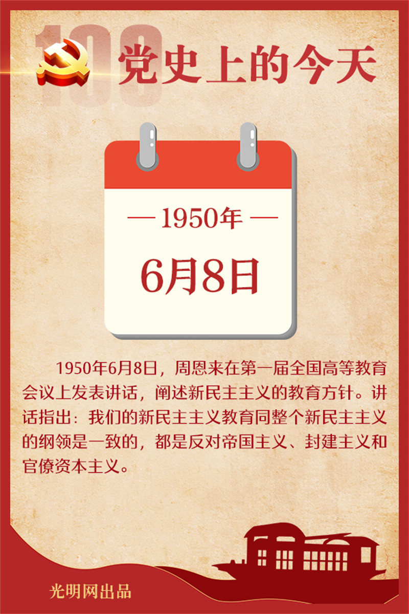 周恩来在第一届全国高等教育会议上发表讲话,阐述新民主主义的教育方针。讲话指出:我们的新民主主义教育同整个新民主主义的纲领是一致的,都是反对帝国主义、封建主义和官僚资本主义。因此,我们在教育上就要肃清封建的、买办的、法西斯主义的思想。我们的教育是大众的,是为人民服务的,这是我们教育的方向;我们的教育是科学的,要有科学的内容;我们的教育是民族的,要有民族的形式。他强调:除了极少数反动分子外,我们应该团结所有的教育工作者,凡是在政治上反对三大敌人、在教育上赞成新民主主义教育的人,我们都要团结。这是肯定和不可更易的方针。教育改革是比较长期的事,要有步骤地进行,但不能停止不动;要区别轻重缓急,在有些问题上要善于等待。这篇讲话收入《周恩来选集》下卷。